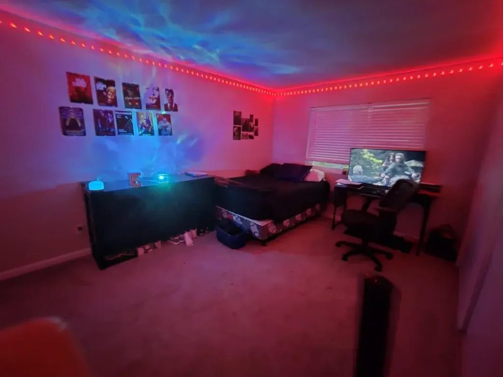What I’d note for anyone attempting this: Projector placement matters more than you’d expect. Position it on a dresser or shelf rather than the floor for better ceiling coverage. The LED strip color you choose sets the entire room’s mood. Red is dramatic and high-energy. Blue or purple reads calmer.
