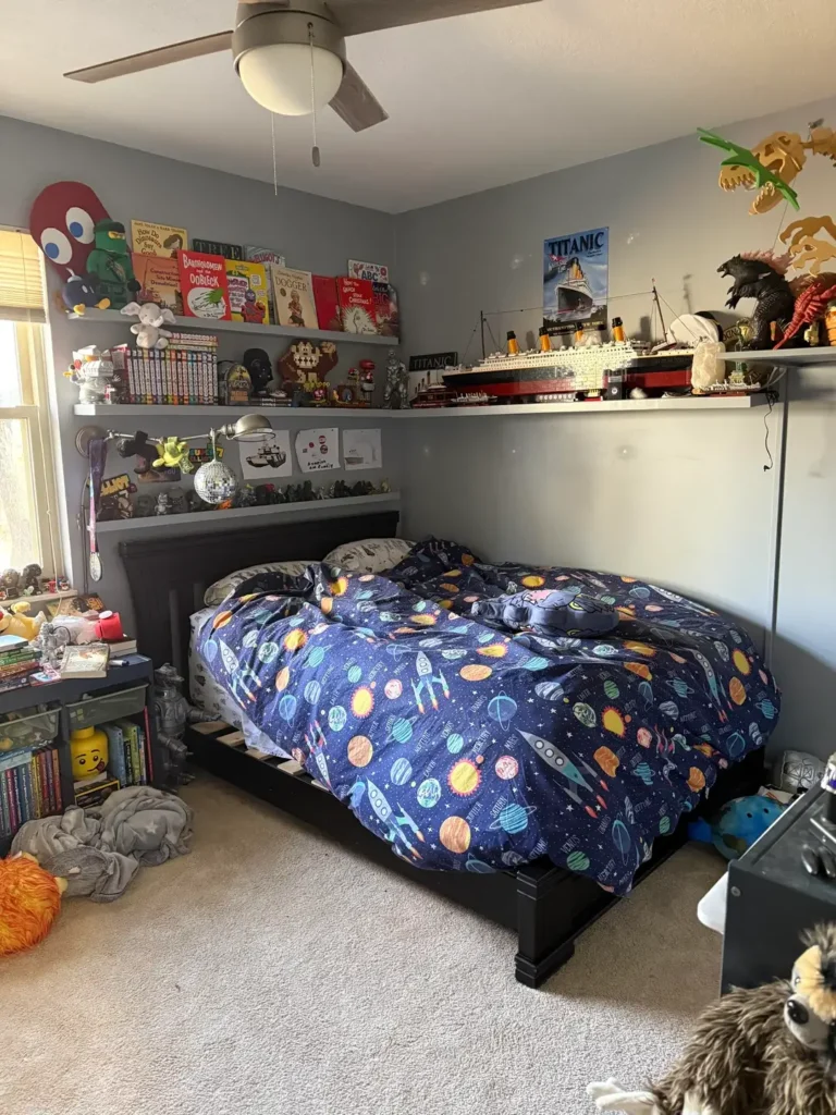 If your son collects things (books, figures, models, LEGO sets), give that collection a proper home instead of trying to hide it or constantly telling him to “clean it up.” Ledge shelves at height keep things visible and accessible while staying out of the daily living zone. The space theme provides cohesion even when the individual items vary wildly.