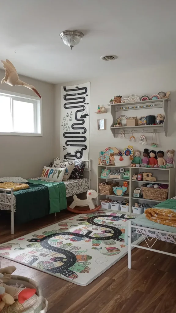 What makes this work: Separation between sleeping zones and play zones. Each bed has slightly different bedding (green tones for one, floral for the other), which gives each child a sense of individual ownership within the shared space. That matters way more than you’d think.