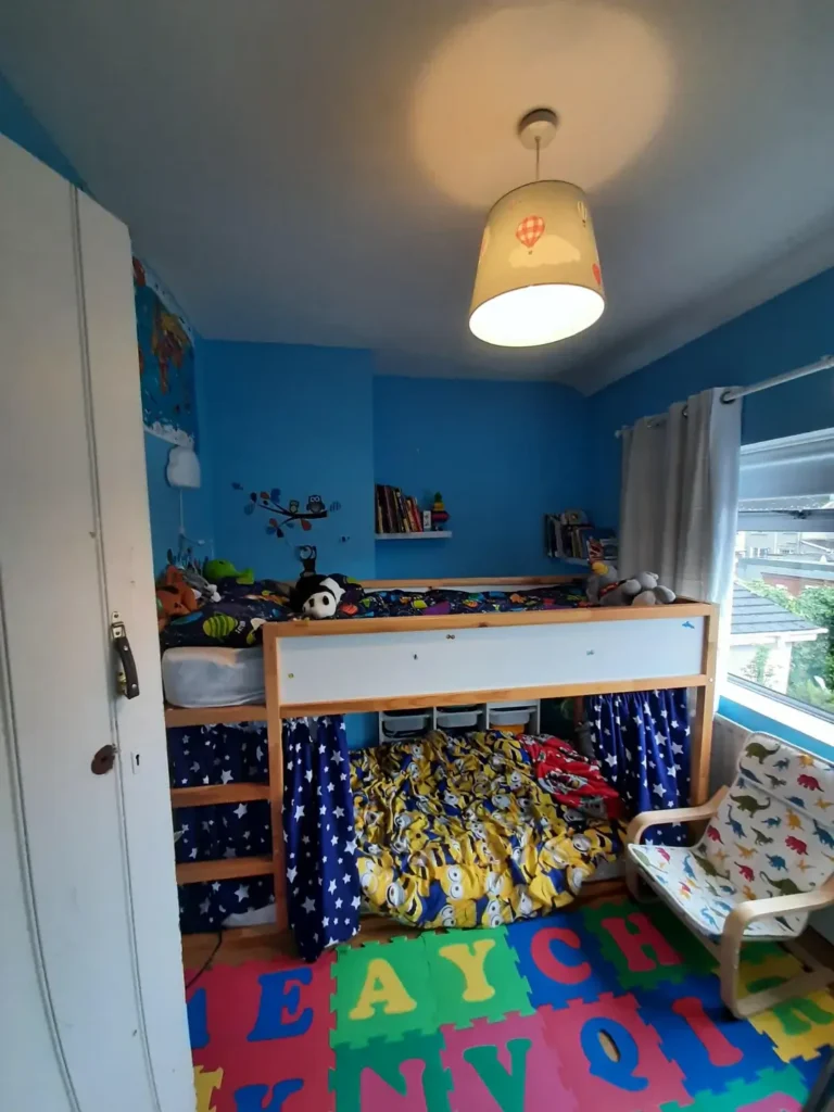 Key insight for shared rooms: Define zones visually, not with walls. A rug, a banner, a dedicated shelf unit create boundaries that children understand intuitively. The room feels organized even when it isn’t (and let’s face it, it usually isn’t).