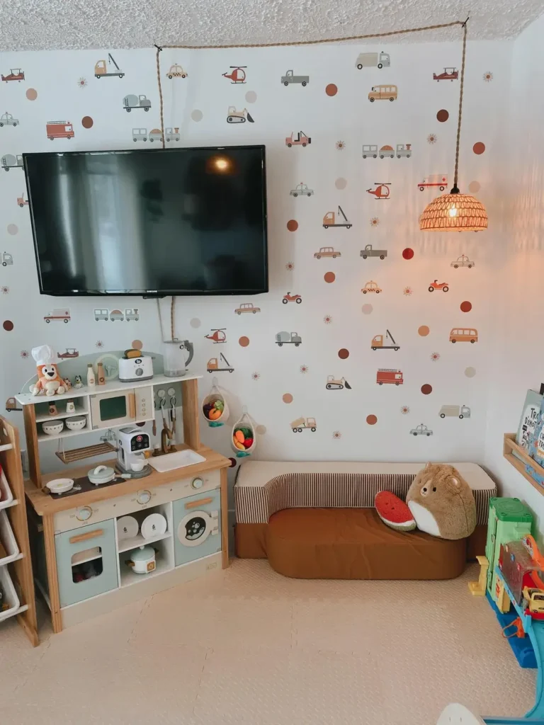 What makes this work: The wall-mounted TV keeps floor space open for actual playing (wild concept, I know). That rope cord running to the pendant light looks intentional, almost nautical. It’s those tiny details that stop a room from looking like you gave up halfway through.