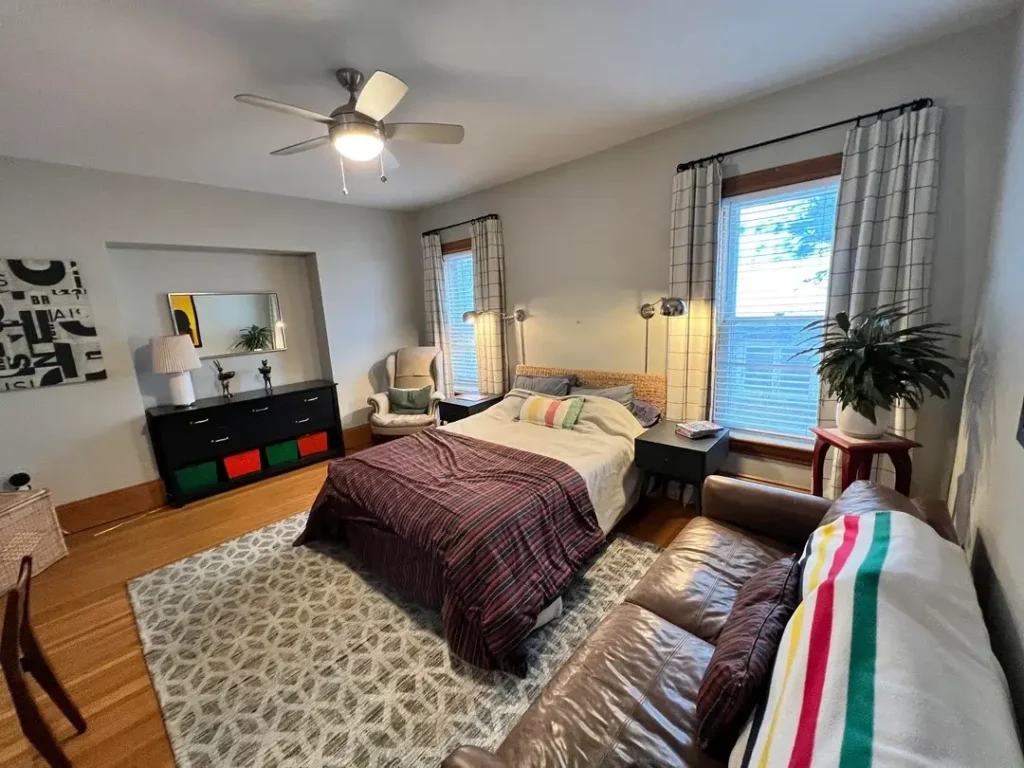 This room goes the mature route: hardwood floors, dark plaid comforter in burgundy and hunter green, brown leather sofa at the foot of the bed, and a tall leafy houseplant in the corner. It looks like a room that could easily belong to a college student or young adult.