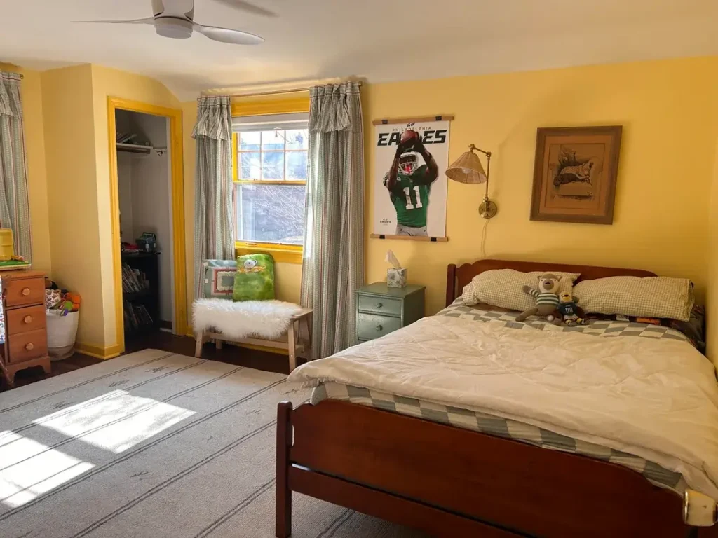The Philadelphia Eagles poster hung on a wooden poster hanger adds the sports element in a way that feels current and deliberate. Not like something taped up at midnight because “we should probably decorate this wall.” The cherry wood bed frame and sage green nightstand are traditional pieces that ground the room. These aren’t trendy finds that’ll look dated in two years.