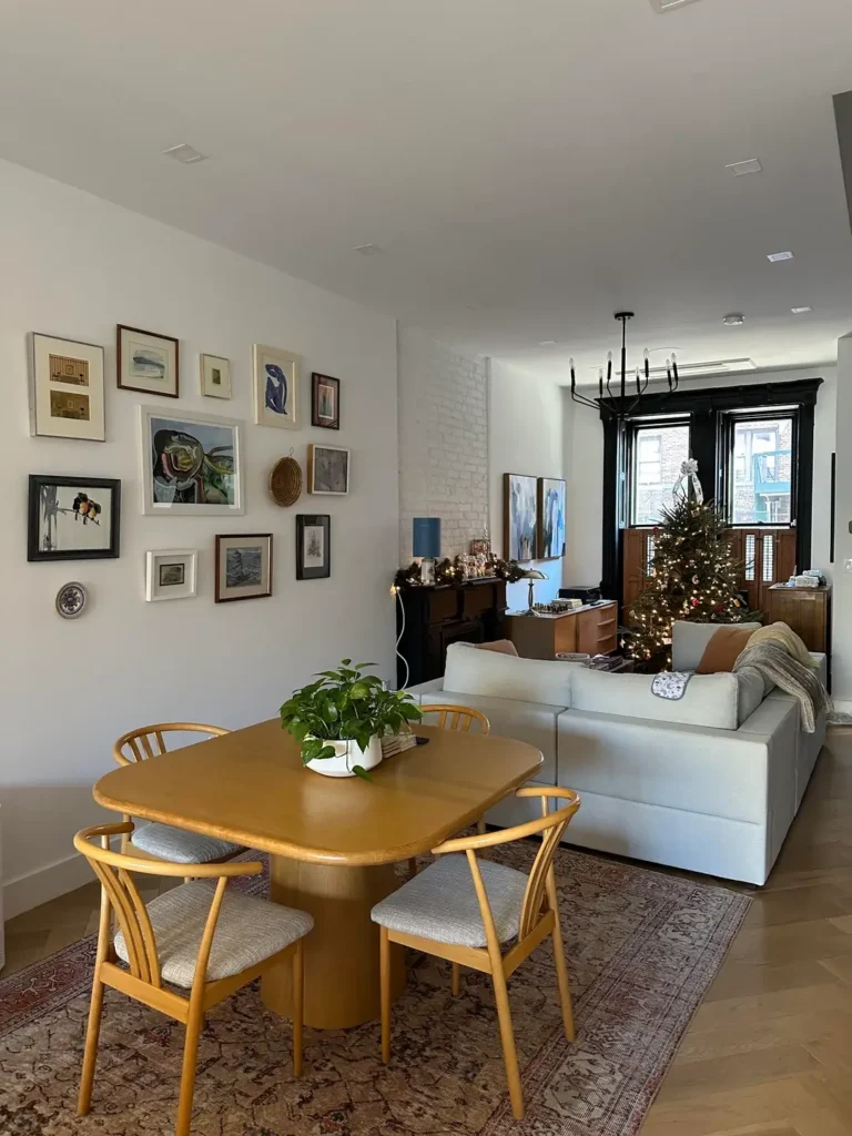 An exposed white brick column separates the dining zone from the living area, and the owners wisely left it unpainted. It creates a natural visual anchor and transition without fully dividing the space. If you live in a converted loft or older townhouse and have an exposed brick or concrete column, keep it. Celebrate it. Don’t hide it behind drywall.