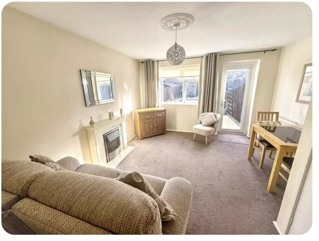 The palette stays all-neutral: cream walls, greige carpet, warm oak tones in the sideboard and small dining table tucked into the right corner. A faceted mirror in a silver frame hangs above the mantel, bouncing light around and making the space feel bigger than it actually is.