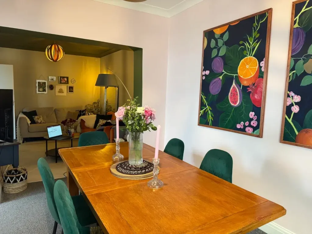 Repetition builds unity. The rooms that feel most cohesive repeat colors, materials, or textures across both zones. It doesn’t need to be obvious. A dining chair in the same green as a sofa pillow is enough. That small thread pulled between zones makes the whole layout read as one home.