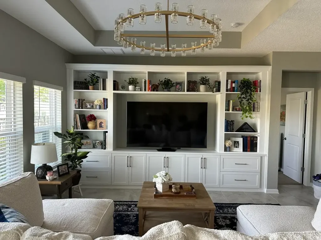 This white built-in spans the entire back wall, framing a large flatscreen TV within a recessed niche. Flanking shelves carry a curated mix of books, framed family photos, small plants, and decorative objects. Not crammed randomly. Organized by height and weight. Intentional.