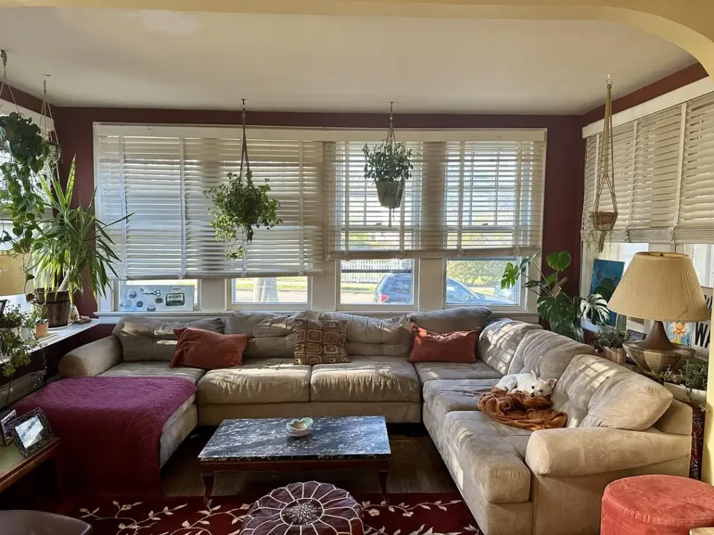 Hanging planters dangle from the ceiling in front of wide windows with white wooden blinds. A large L-shaped sectional in soft beige fills most of the floor plan, dressed with rust-toned throw pillows and a burgundy throw blanket.