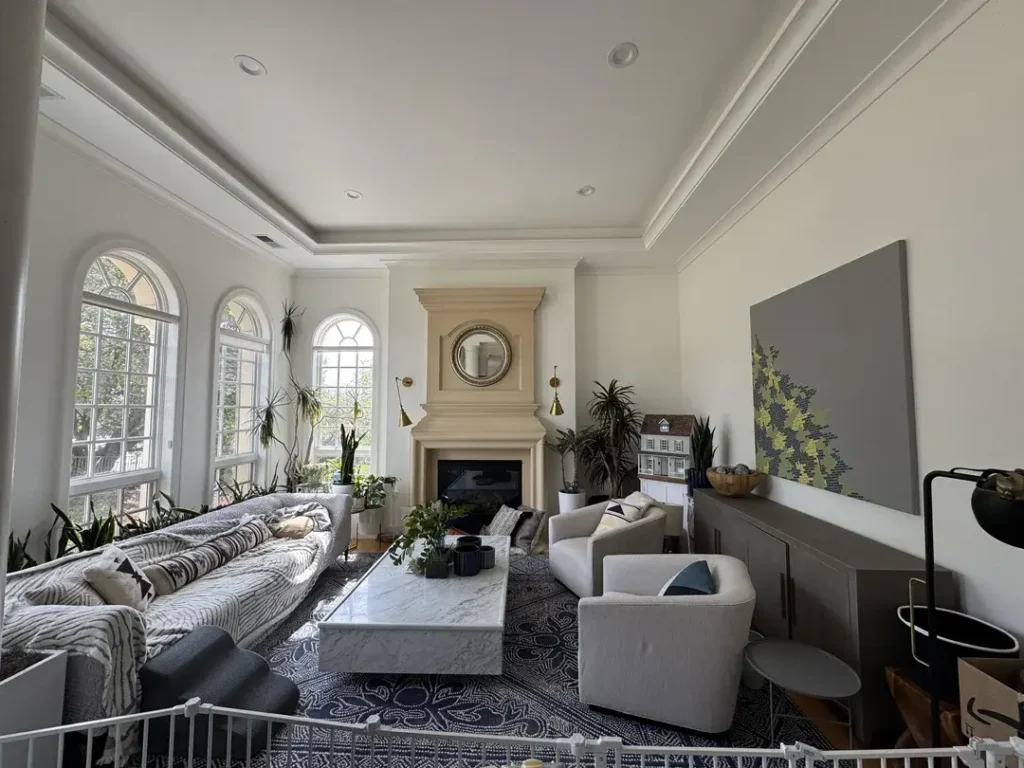 This living room sits inside what appears to be a period home. The architecture alone does most of the work. Arched multi-pane windows flood one wall with structured natural light. The kind architects no longer build into standard construction. A limestone fireplace with a convex gold-framed mirror above it anchors the opposite end. Crown molding runs the full perimeter.