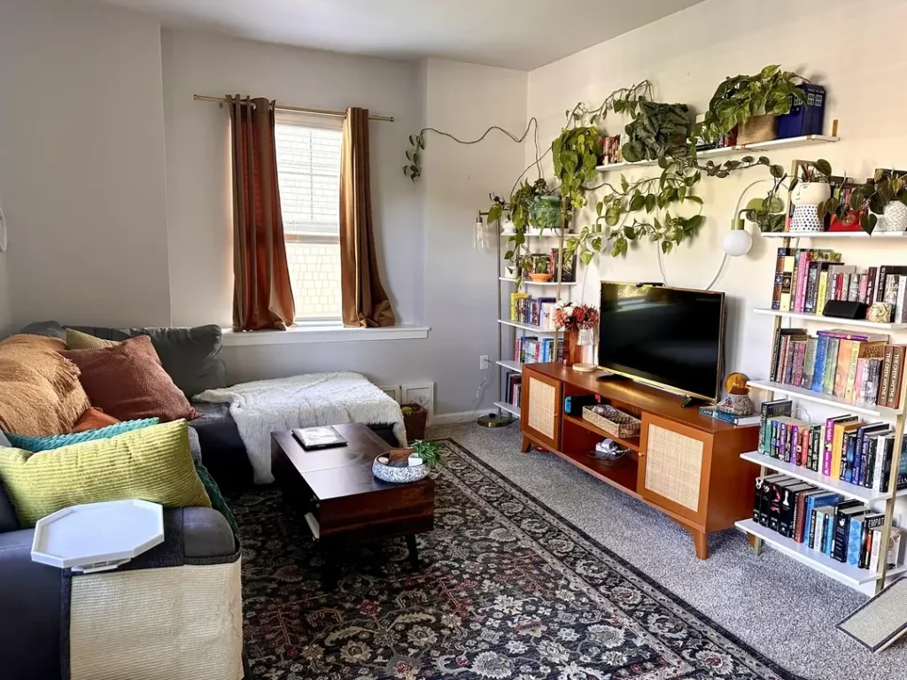 What stops this from looking like pure chaos? The underlying structure. The books are organized (loosely, but they’re organized), and the clean shelving grid gives all those organic plant shapes something to play against. Warm rust-colored curtains add depth without competing for attention.