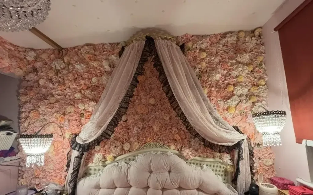 This is the most maximalist entry in the collection, and I need to be upfront: it takes a very specific personality and commitment level to pull this off. The entire headboard wall is covered floor-to-ceiling in an arrangement of faux flowers. Pink peonies, blush roses, cream dahlias, soft yellows. A dense, dimensional floral surface.
