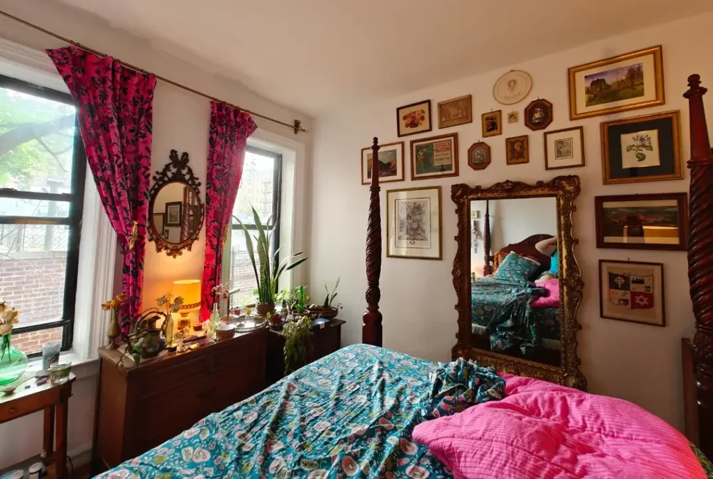 Some rooms can only be described as maximalist with conviction, and this bedroom gallery wall absolutely earns that description. The entire wall above a four-poster bed is covered with a dense arrangement of framed pieces: oil paintings, vintage prints, photographs, a decorative plate, a small embroidery hoop. At the center sits an oversized gold ornate-framed mirror, large enough to dominate the arrangement while still playing as just one element among many.