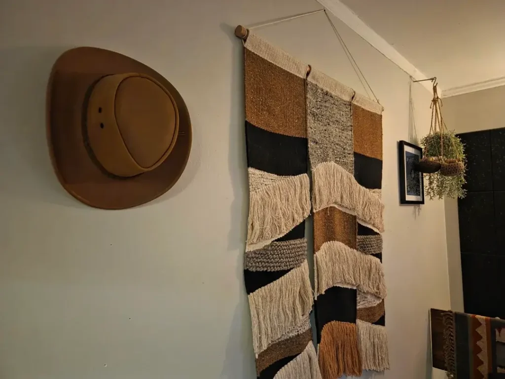 That hat is doing serious work. On its own, it’d just be quirky. Next to the textile, it becomes part of a cohesive story about natural fibers, warm earth tones, and handcrafted objects. A framed print and a hanging plant in a macramé planter round out the wall composition, and everything feels intentional without looking overly curated.