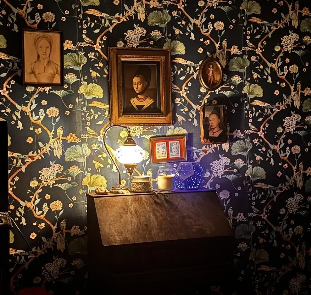 The portraits could easily look out of place on this busy background, but they work because their dark color values blend partially into the wallpaper while their frames provide contrast. A vintage oil lamp on the desk below completes the atmosphere. This is not a room that stumbled into its look by accident.