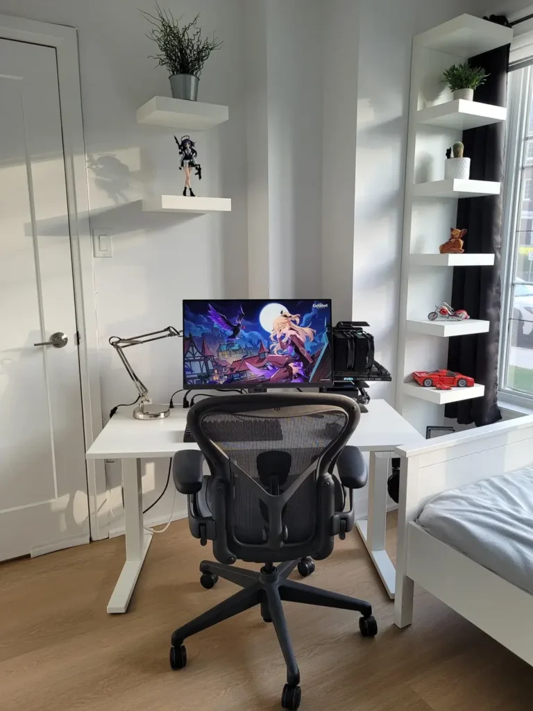 One shelf sits above the desk with a single anime figure positioned like it’s the star of the show. Meanwhile, the taller shelf unit next to the window displays an eclectic mix: tiny succulents, a plush toy, a miniature motorcycle, and a bright red sports car model. Nothing matches, and that’s exactly what makes it work.