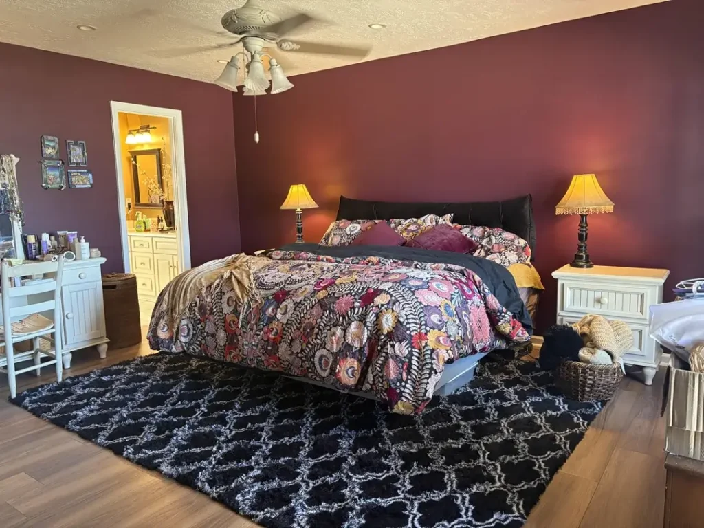 This bedroom proves the point beautifully. Deep, saturated burgundy paint (think rich merlot red) wraps all four walls, and it completely transforms the space even with minimal artwork. Against this moody backdrop, the floral bedding in pinks, oranges, and purples looks coordinated and intentional instead of random and chaotic.