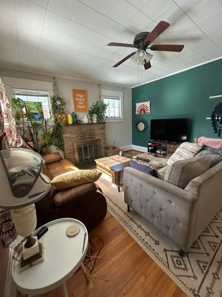 The decision I find most interesting: Rather than painting the entire room (which would have been a heavier commitment), this homeowner painted a single wall in a deep teal. It creates a natural focal zone around the television, and the decor choices on that wall reinforce the boho aesthetic without overwhelming the space.