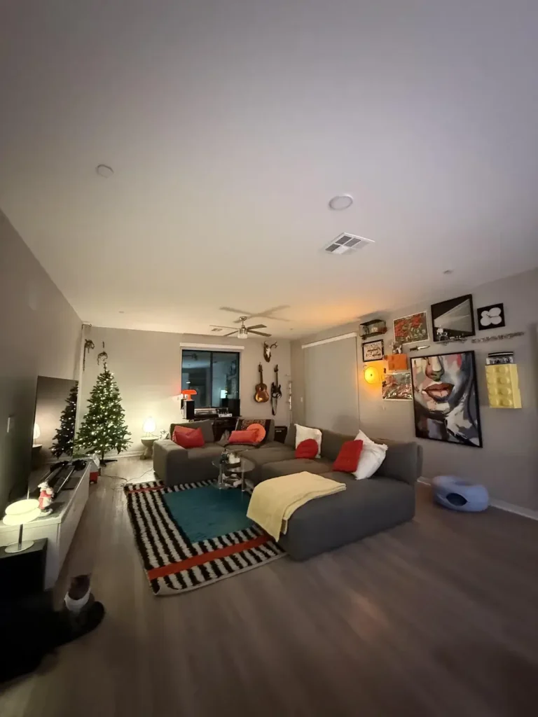 Here’s the clever part: an orange ambient light fixture glows among the frames, acting as both decor and illumination. On the opposite side of the room, two acoustic guitars hang on the wall near an antler mount. Completely different wall surface, completely different vibe, but it works together.