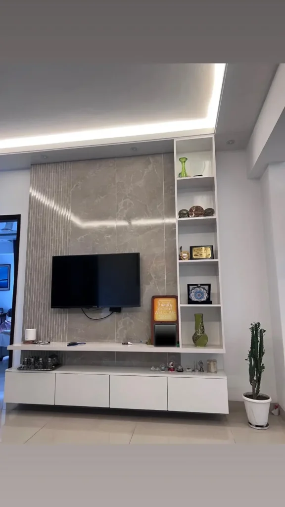 A built in feature wall centers on a large flat screen television mounted against marble effect panels in a warm gray veining pattern. Vertical fluted or ribbed detailing runs through the center panel, adding tactile depth to the stone look surface. To the right, an asymmetric open shelving unit in glossy white integrates directly into the wall, with shelves at varying heights holding green glass vases, decorative plates, a tiled plaque, and a small illuminated “Family” sign. Below the TV, a floating white media unit with push open drawers provides clean storage. Cove lighting runs along the ceiling edge, casting a soft upward wash that defines the entire wall zone as intentional architecture.