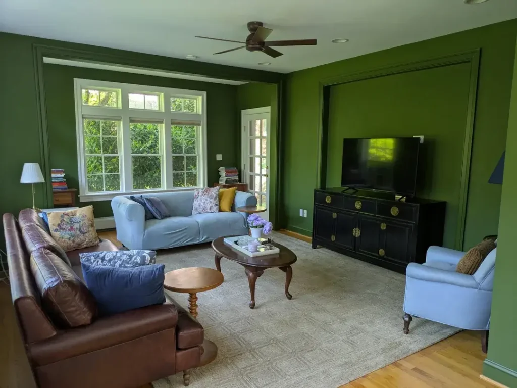 This traditional style living room demonstrates something that gets underestimated constantly: a deeply saturated wall color, applied confidently, makes additional wall decor nearly unnecessary. The walls are painted in a rich olive green somewhere between forest and moss. Crisp white crown molding and window trim create contrast. The TV is recessed into a framed panel on the right wall, treating the television as an architectural element rather than an afterthought.