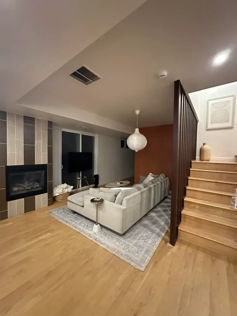 A basement level living room features honey toned oak flooring, a large cloud gray sectional sofa, and a fireplace wall clad in vertical striped ceramic tiles in beige and taupe. The most notable wall decision is quieter than anything else in this collection: on the wall adjacent to a staircase, a terracotta accent panel (a warm burnt orange red) provides color behind a staircase railing in dark stained wood. On that terracotta wall, a single framed print of a minimalist arc rainbow line drawing in cream on a neutral background hangs above a small ledge holding a woven basket vase.