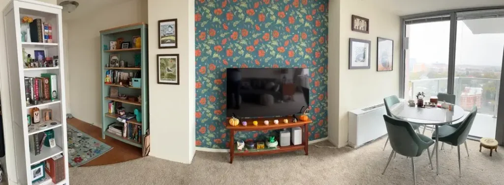 What also works: Each wall has its own identity, but they share a color energy. Both warm, both expressive, neither minimal. The room communicates personality without being obnoxious about it.